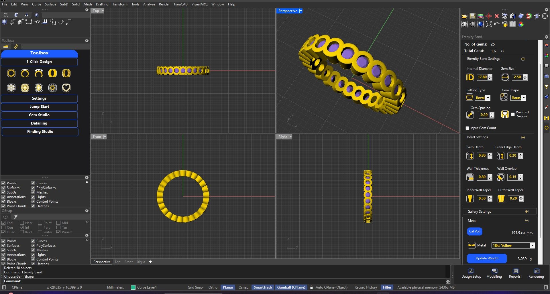 Volume calculation in TiaraCAD is based on the latest functionality. It allows for accurate volume detection. Based on the metal density chosen, weight of the chosen metal is calculated.