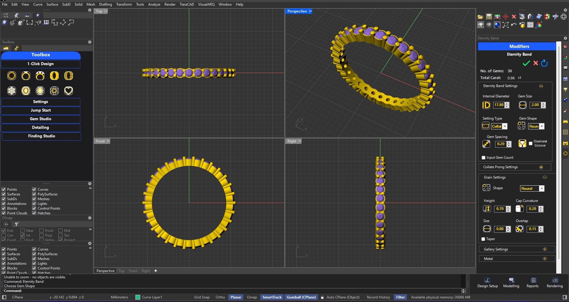 Just select 1 curve and find the entire pave set on the curve, complete with the desired wall thickness, depth of pavé and cutters in one go. Just modify your gem size and count as per your design and carat weight.